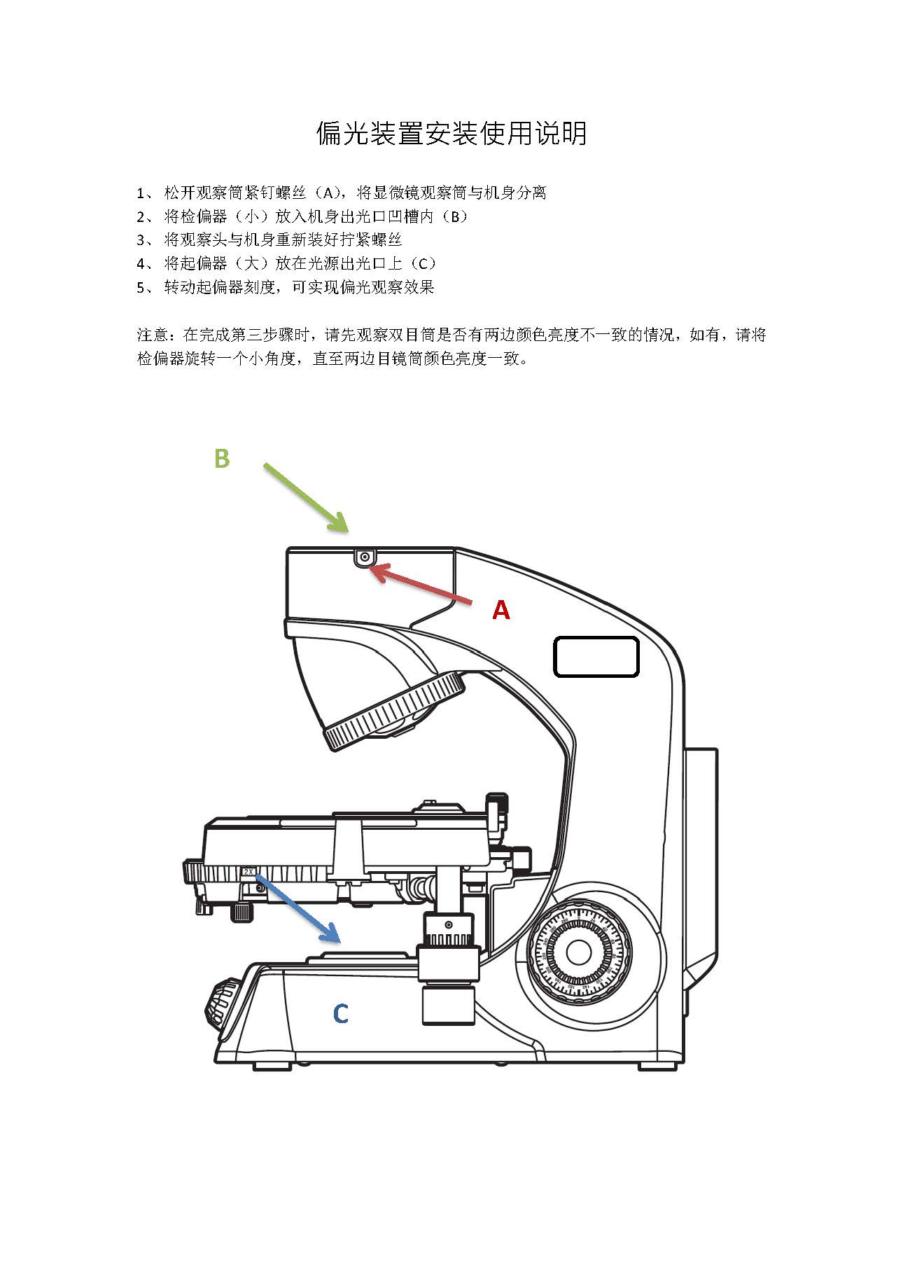 起偏镜通常是放置于聚光镜下方光源出光口上的45mm滤色镜凹槽内,旋转可实现偏光效果的调整,检偏镜放置于观察筒下方的机身通光孔上,需要将观察筒右侧螺丝松开取下,装入检偏镜。