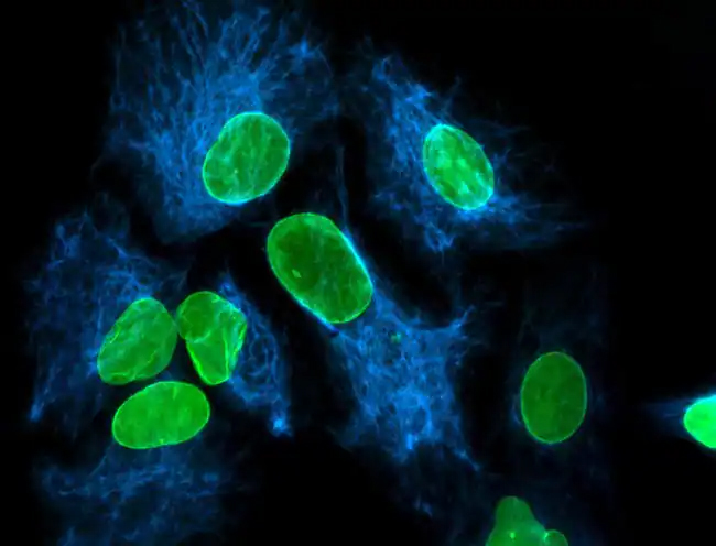 Cytokeratin 18 (blue) and lamin A (green) in A549 cells were fluorescently labeled with specific primary antibodies and DyLight 405-Conjugated Highly Cross-Adsorbed Goat Anti-Rabbit or DyLight 488-Conjugated Goat Anti-Mouse Secondary Antibodies, respectively.