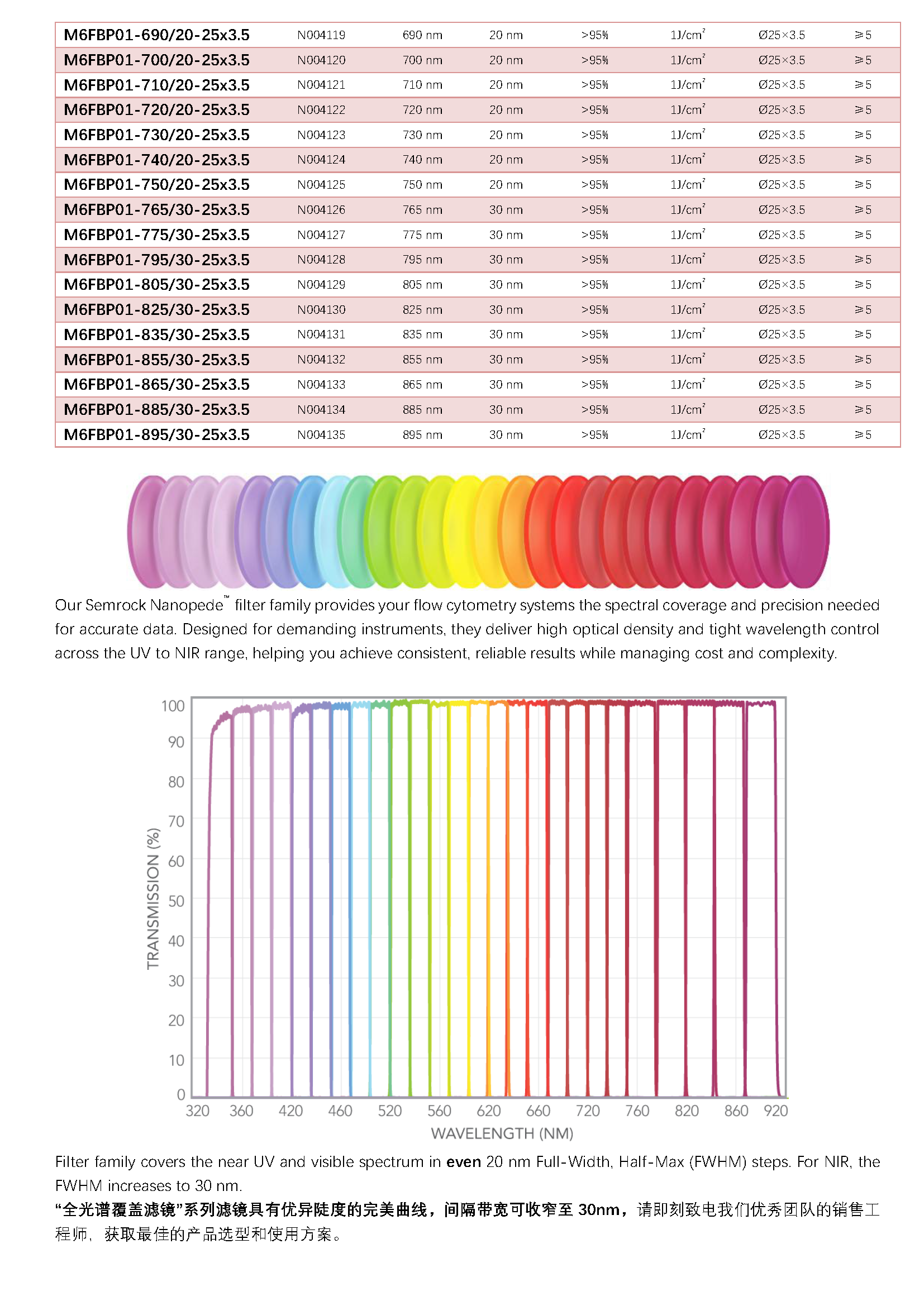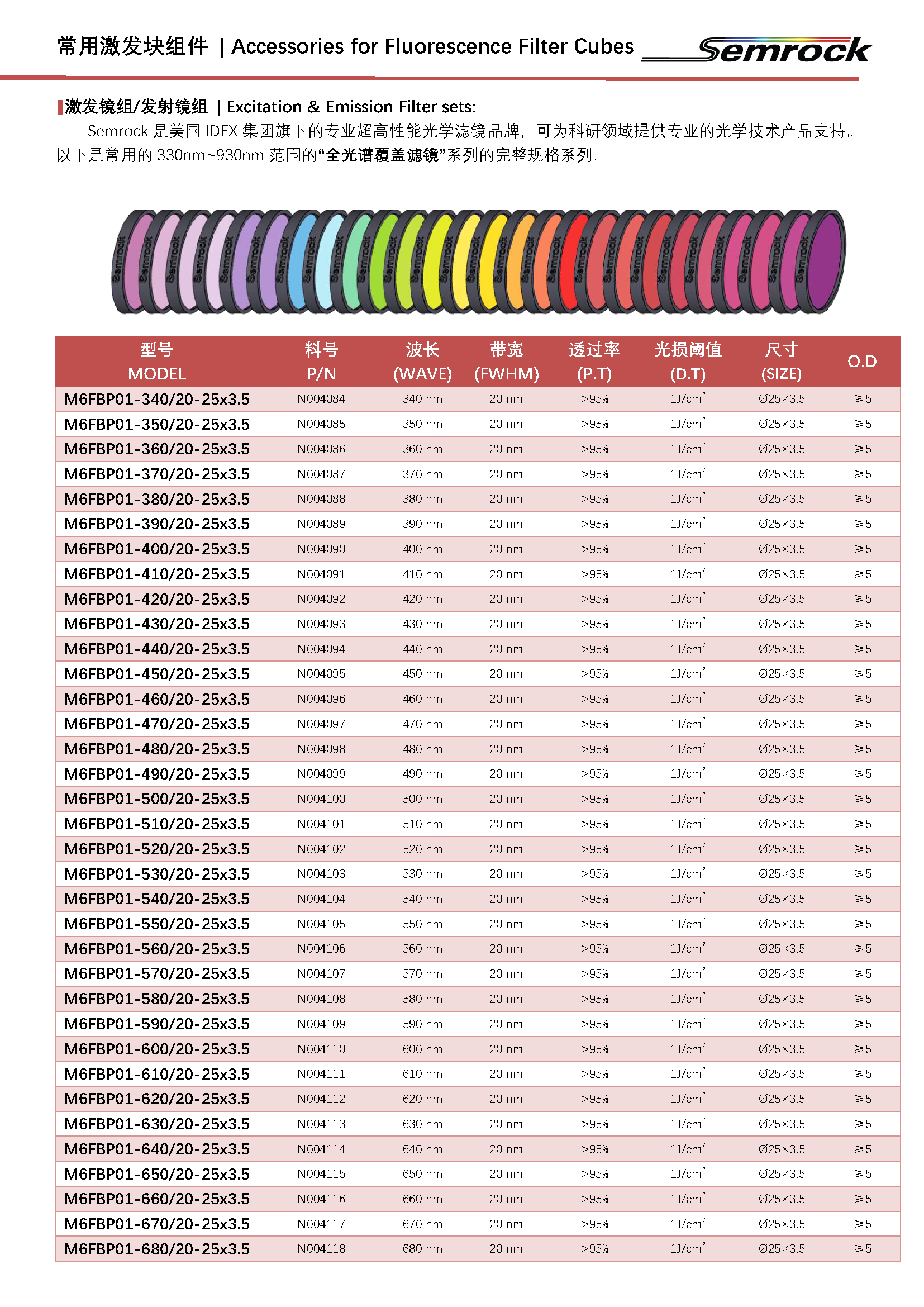SEMROCK是美国IDEX集团旗下的高性能滤光片品牌,可为专业科研用户提供高性能光学滤光片及照明、成像解决方案。“全光谱滤光片”系列标准尺寸(Ø25×3.5)滤光片覆盖了330nm至930nm宽光谱区间,以10nm为渐进尺度,提供陡度极高,FWHM带宽仅20nm-30nm的系列滤镜组,峰值透过率>95%,光损阈值1J/cm2,OD≥5。可广泛用于各类物理学、光学、生物学、医学研究领域及各类光谱、成像、自动化设备的制造。需要进一步了解更多产品选型信息,请联系我们专业团队的销售工程师以获得帮助。